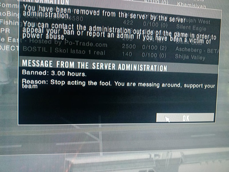 good evening! Today I was playing in the "trans" squadron on the battle of la drang map and when I was going to leave a squadron I unintentionally touched a tree with the back of the helicopter which caused me to crash, after a few seconds it applied to me a 3-hour ban for supposedly fooling around and not supporting the team, which is a lie because it was simply an accident, also the "cas" squad when getting on the plane in main dropped a bomb while on the ground which makes it fall destroy, report the fact 2 times and they did nothing. My sanction has one hour left, which I would like to see revoked, but pay attention to the administrators, thank you very much!