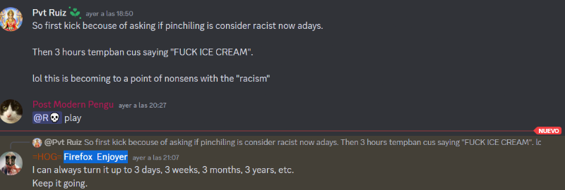 I do not want unban cuz im not banned anymore, but just want to point at those who hate the ICE CREAM how this work ? if I say cake is fine but if I say ice cream got ban 3 hours? then then an admin threatens me to make it 3 days or 3 weeks or 3 years ban cuz asking in the discord: